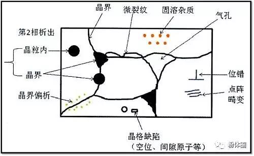 AlN是一種強共價鍵化合物,其熱傳導機理是晶格振動(即聲子傳熱)。由于Al和N的原了序數小,從本性上決定了AlN具有很高的熱導率,其熱導率理論值可高達319W/m·K。但在實際產品中,由于AlN的晶體結構可能完全均勻分布,并存在很多雜質和缺陷,如圖5所示,使得其熱導率般只有170-230W/m·K。在熱傳導過程中,晶體中的各種缺陷(如點陣畸變、位錯、雜質、氣孔、微裂紋)、晶界、界面、第二相以及聲子本身都會對聲子產生干擾和散射,從而大大降低基板的熱導率。